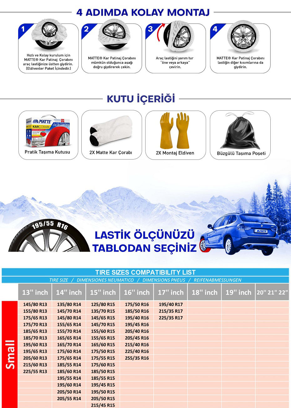 Karlı ve Buzlu yol koşullarında eşsiz yol tutuşu ve direksiyon hakimiyeti sağlayan Matte Kar Patinaj Çorapları, yola tutunma özelliği ve dayanıklılığı son derece yüksek ileri teknoloji tekstil ürünlerinden imal edilmiştir.
